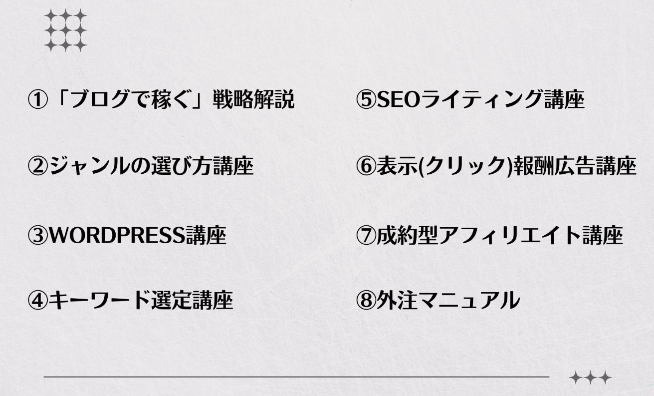 要は副業として、ブログアフィリエイトをはじめとしたwebビジネスをお教えしますよ〜ということですが、中には