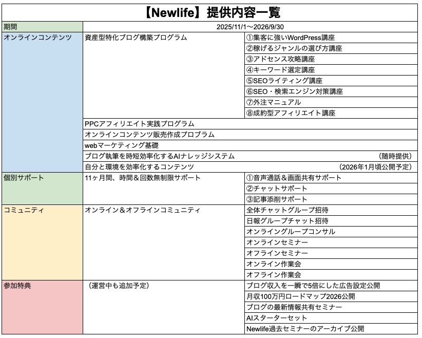 ブログアフィリエイト・コンテンツ販売・情報発信などに関するスキル・知識・マインド・ノウハウをお伝えしながら、仲間と一緒に目標に向かって進んでいく、そして将来は自分の望む新しい人生を歩んでいく、というコンセプトです。